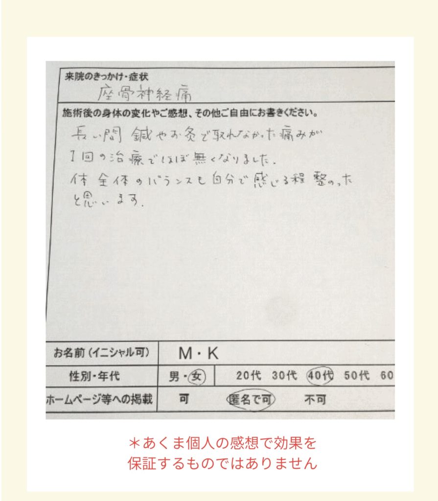 いろんな治療を受けてきましたが、誰もやっていないような施術法に驚きました。